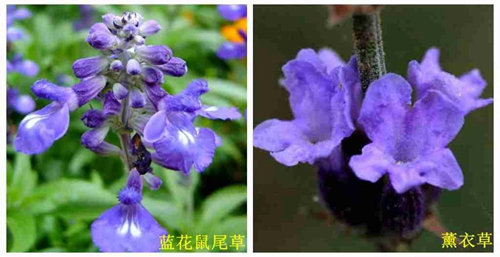 2.花形:薰衣草花梗為綠色,花瓣上唇直伸,2裂,裂片較大,圓形,且彼此稍重疊,下唇開展,3裂,裂片較小,有藍色、深紫色、粉紅色、白色等,常見的為紫藍色;而藍花鼠尾草花梗則為紫色,花瓣上唇瓣小,橢圓形或卵圓形,先端微缺,下唇瓣大,3裂,裂片上有明顯的白色斑點,中裂片較大,側裂片較小。